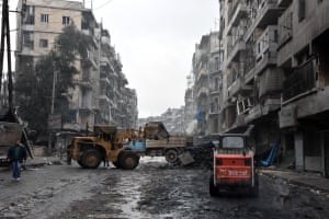 A tractor removes rubble as the Syrian government starts to clean up areas formerly held by opposition forces in Aleppo. Photograph: AFP/Getty